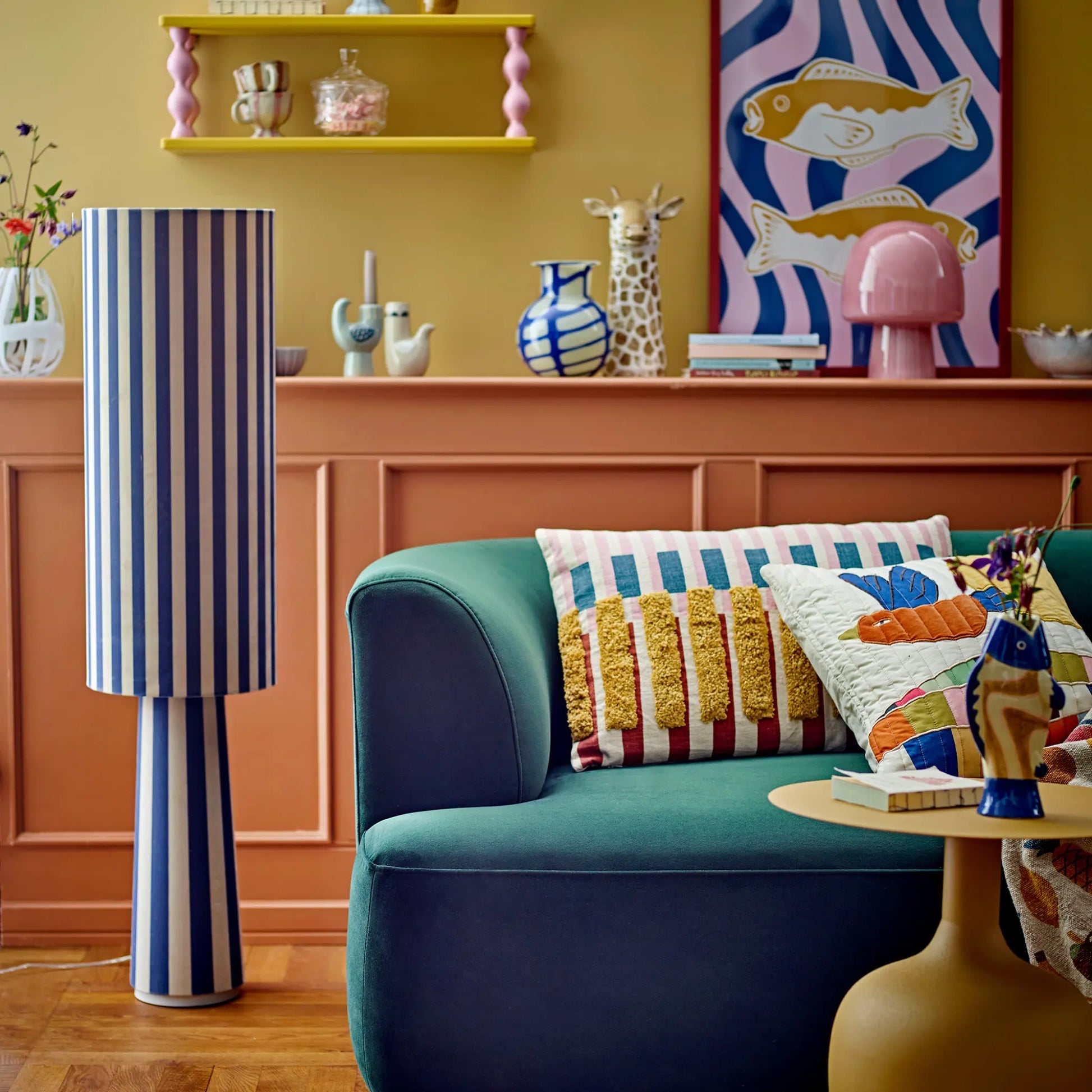Emmie golvlampa i blå polyester från Bloomingville är en dekorativ golvlampa med ett grafiskt och modernt uttryck. Den cylindriska lampskärmen i textil har vertikala ränder som skapar ett mjukt och stämningsfullt ljusspel i rummet. Lampan passar väl i vardagsrum, sovrum eller läshörna och har en smal form som är lätt att placera. Golvlampan är anpassad för E27 ljuskälla av vanlig typ eller LED med max 40 W för glödlampa, LED 5 W eller CFL 9 W. Den har transparent sladd med fotströmbrytare och en sladdlängd på 200 cm samt är avsedd för inomhusbruk. Ljuskälla ingår ej.