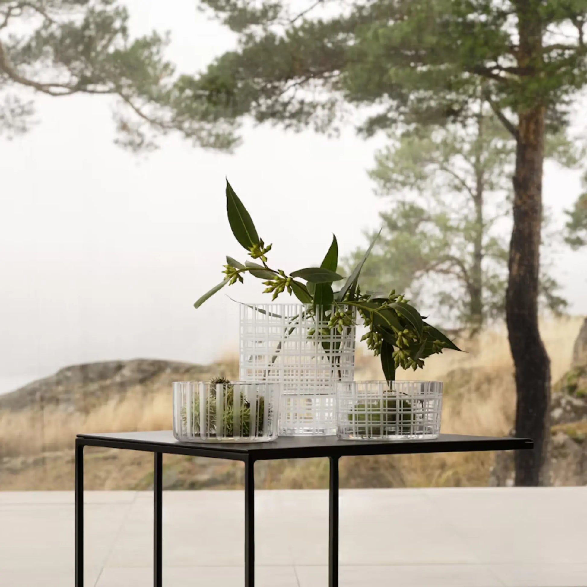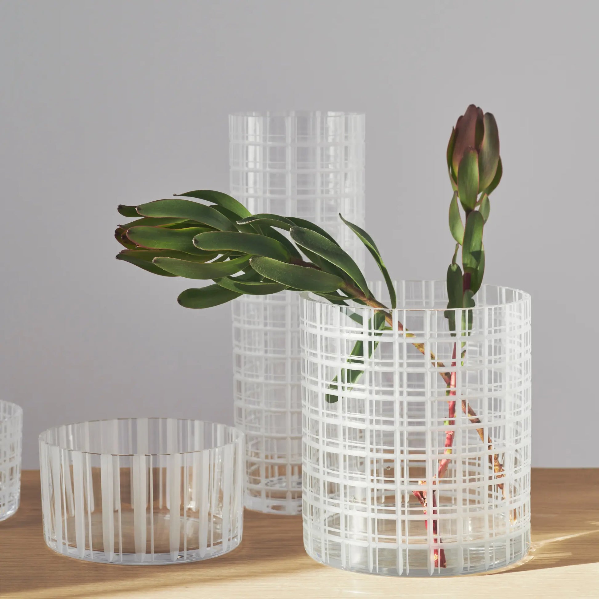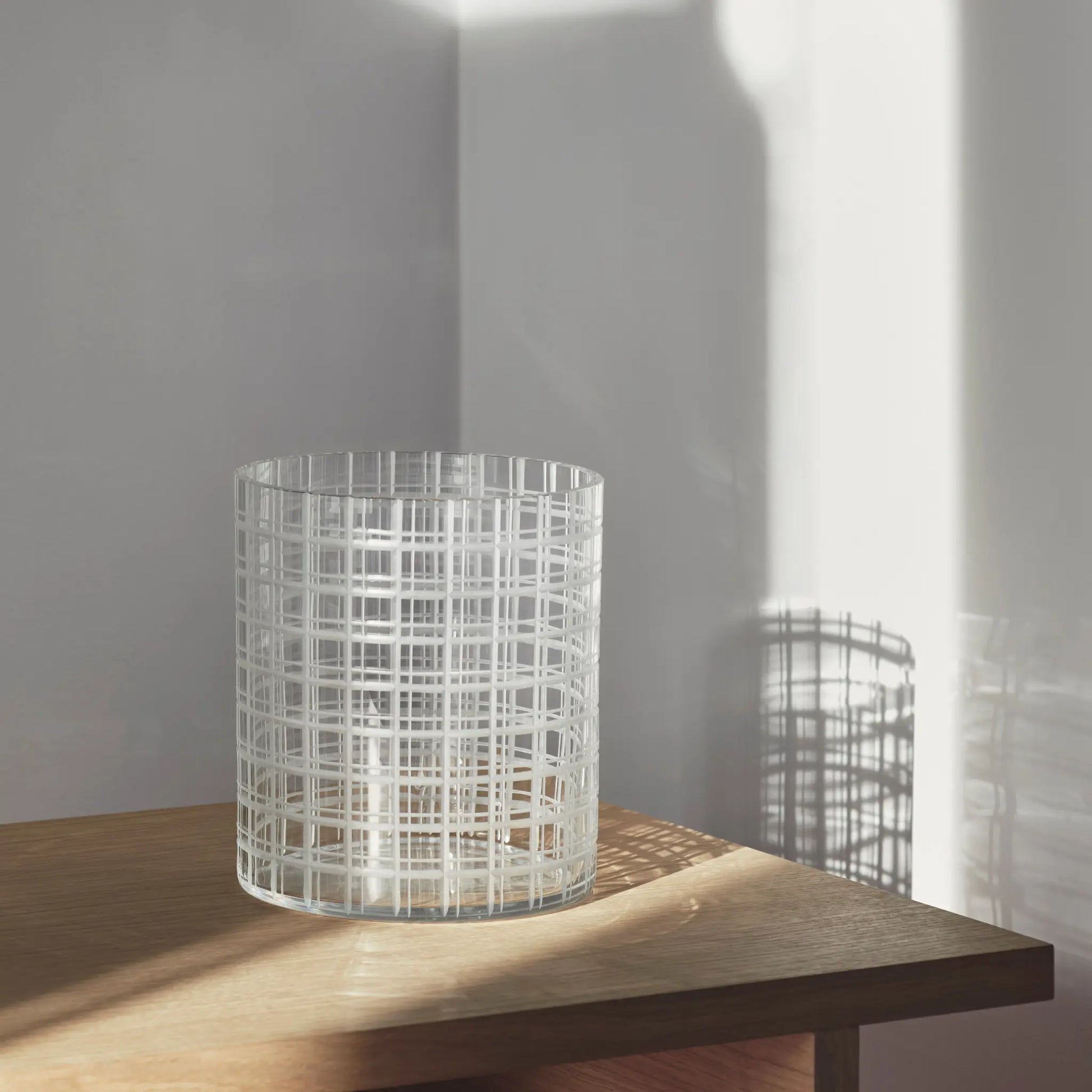 Cut In Number vas rutmönster 200 mm från Orrefors är en låg och bred vas i kristallglas, formgiven av Ingegerd Råman. Det mattslipade rutmönstret framhäver glasets klara transparens och ger en elegant struktur som fångar ljuset vackert. Vasen är idealisk för lägre buketter eller grönska och blir ett tidlöst inslag i både moderna och klassiska miljöer. Ett harmoniskt exempel på skandinavisk design där enkelhet möter precision.