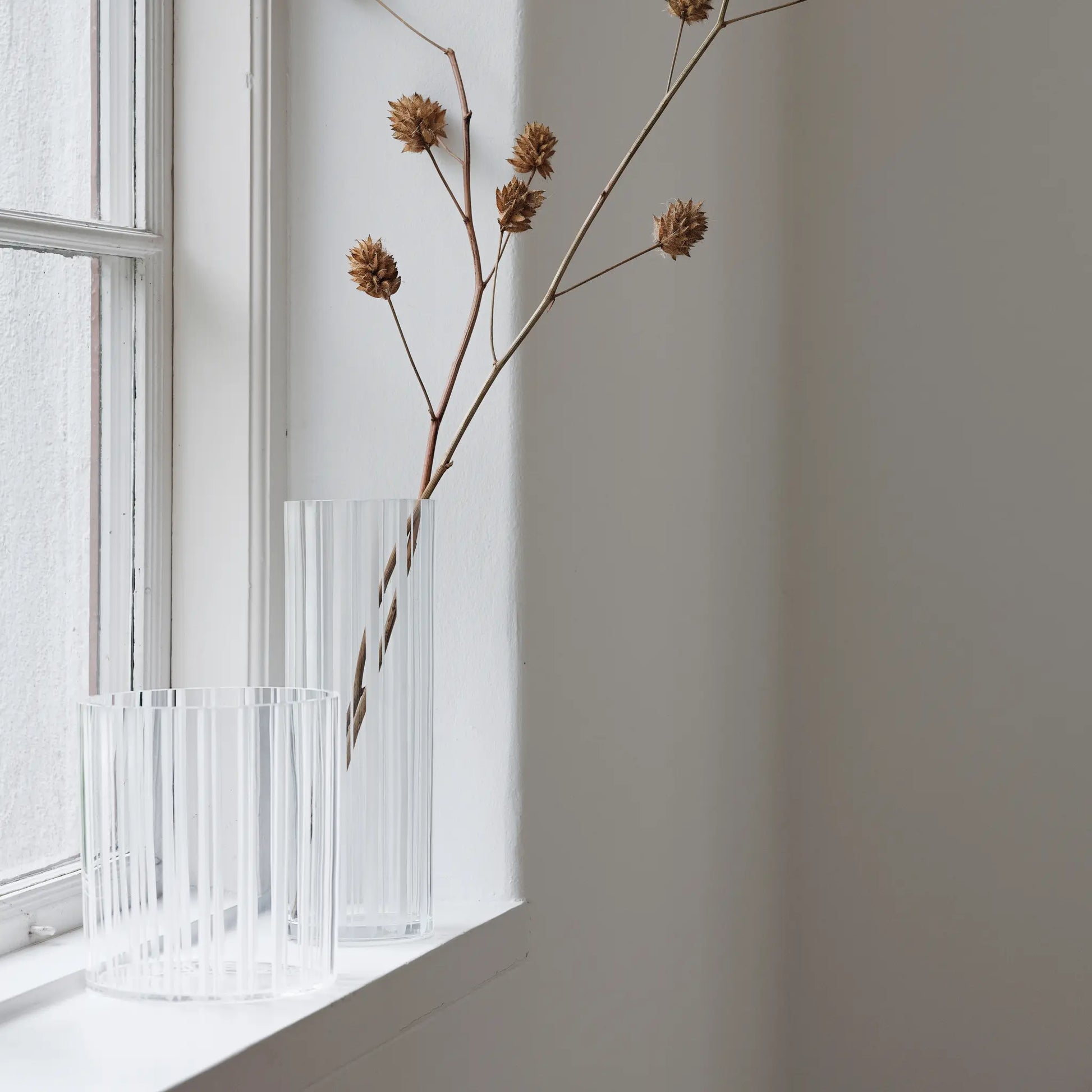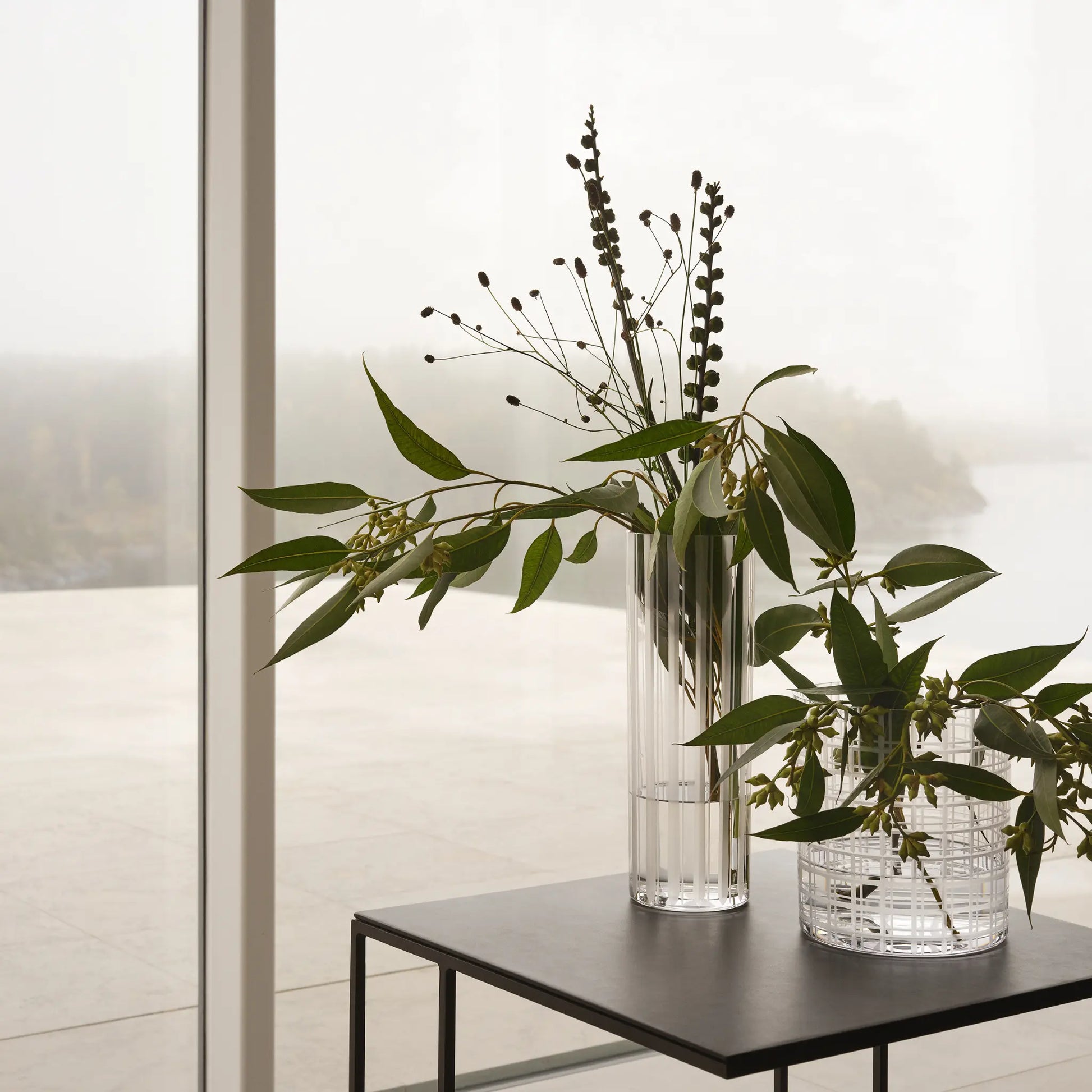 Cut In Number vas ränder 330 mm från Orrefors är en hög cylinderformad vas i kristallglas, designad av Ingegerd Råman. Det mattslipade, linjära mönstret skapar ett elegant uttryck och framhäver glasets klara transparens. Vasen är idealisk för längre snittblommor och tillför en känsla av modern enkelhet i hemmet. Med sin skandinaviska form och tidlösa design blir den ett sofistikerat blickfång i alla rum.