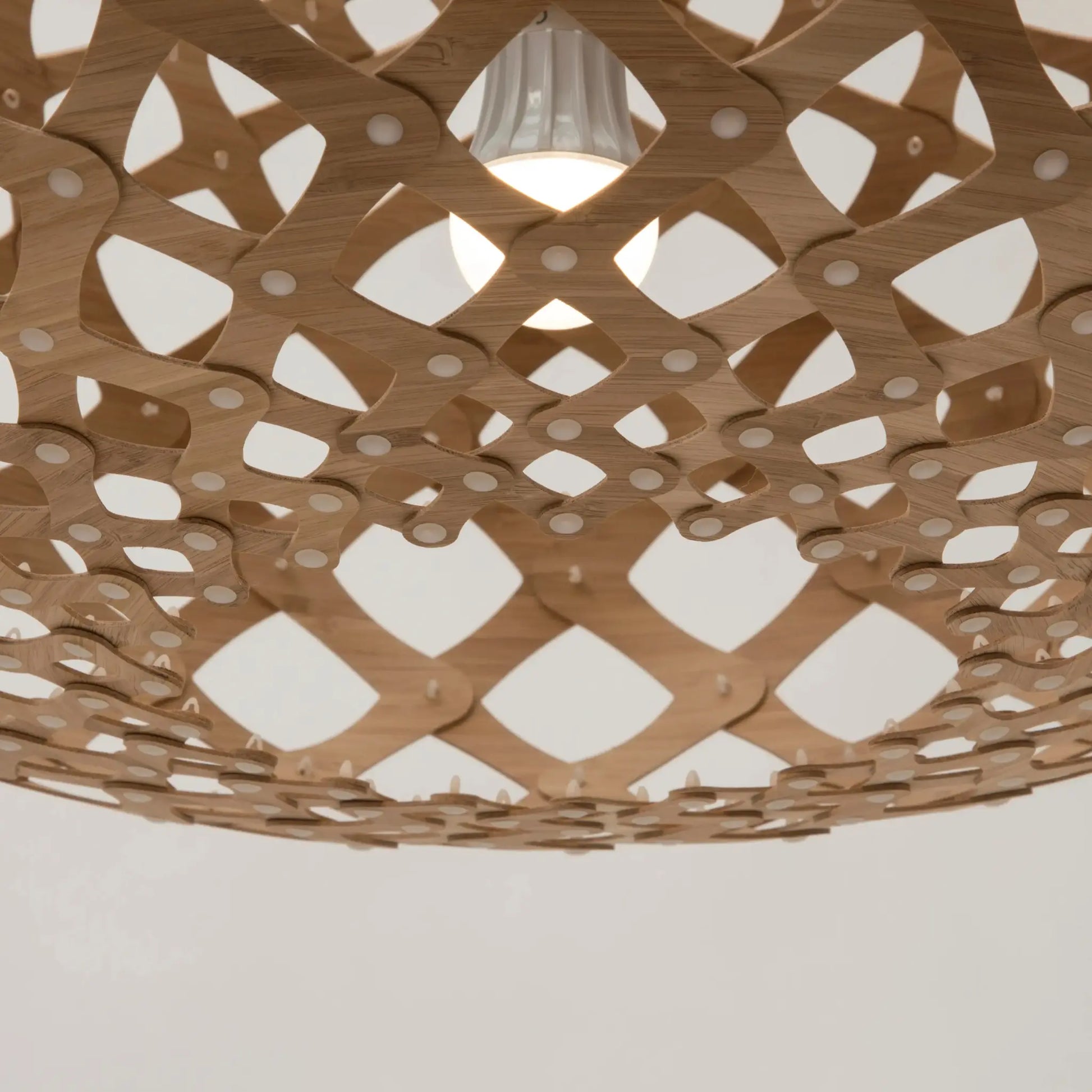 Kina taklampa i bambu från David Trubridge är en skulptural och låg taklampa med ett öppet, flätat formspråk som ger ett luftigt och grafiskt uttryck i rummet. Den breda och mjukt rundade siluetten skapar ett levande ljusspel där ljuset filtreras genom bambustrukturen och ger en varm och behaglig atmosfär. Lampan fungerar både som stämningsbelysning och som ett tydligt dekorativt blickfång i interiören och bidrar till ett lugnt och harmoniskt helhetsintryck. Kina är avsedd för torra inomhusmiljöer och levereras utan ljuskälla. Lampan levereras omonterad och måste monteras själv. Rengöring sker med en mjuk trasa lätt fuktad i varmt vatten när lampan är avstängd.