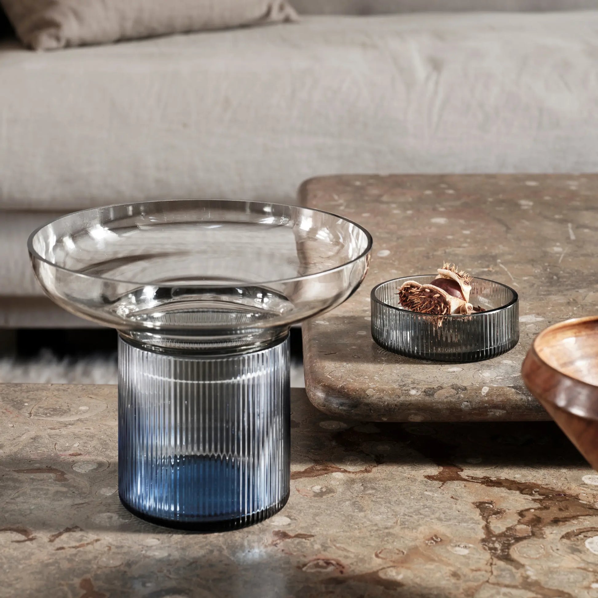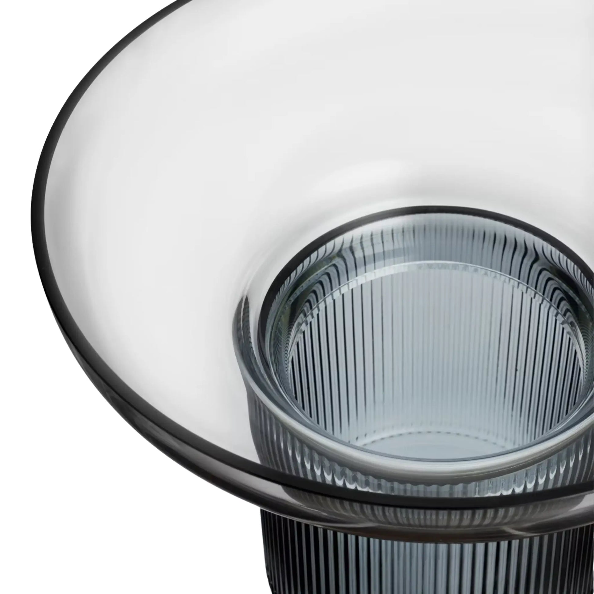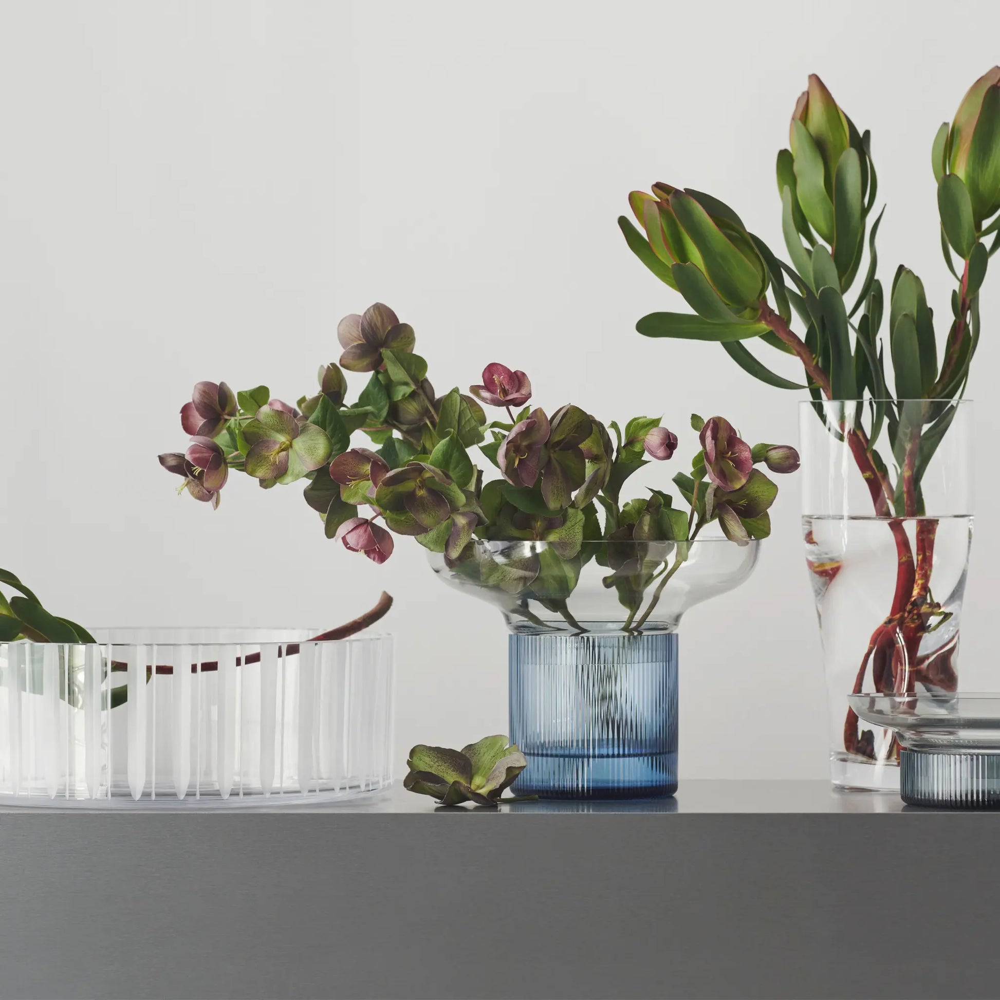 Orrefors Ensemble vas blå grå 150 mm är en stilren och modern vas designad av Benjamin Hubert. Den består av två delar i glas, en blå cylinder med räfflad struktur och en grå klar topp, vilket skapar en harmonisk balans mellan färg och form. Den distinkta silhuetten och de minimalistiska linjerna framhäver innehållet på ett elegant sätt. Passar lika bra till snittblommor som till dekorativa arrangemang. Handdisk rekommenderas, torka med mjuk trasa.