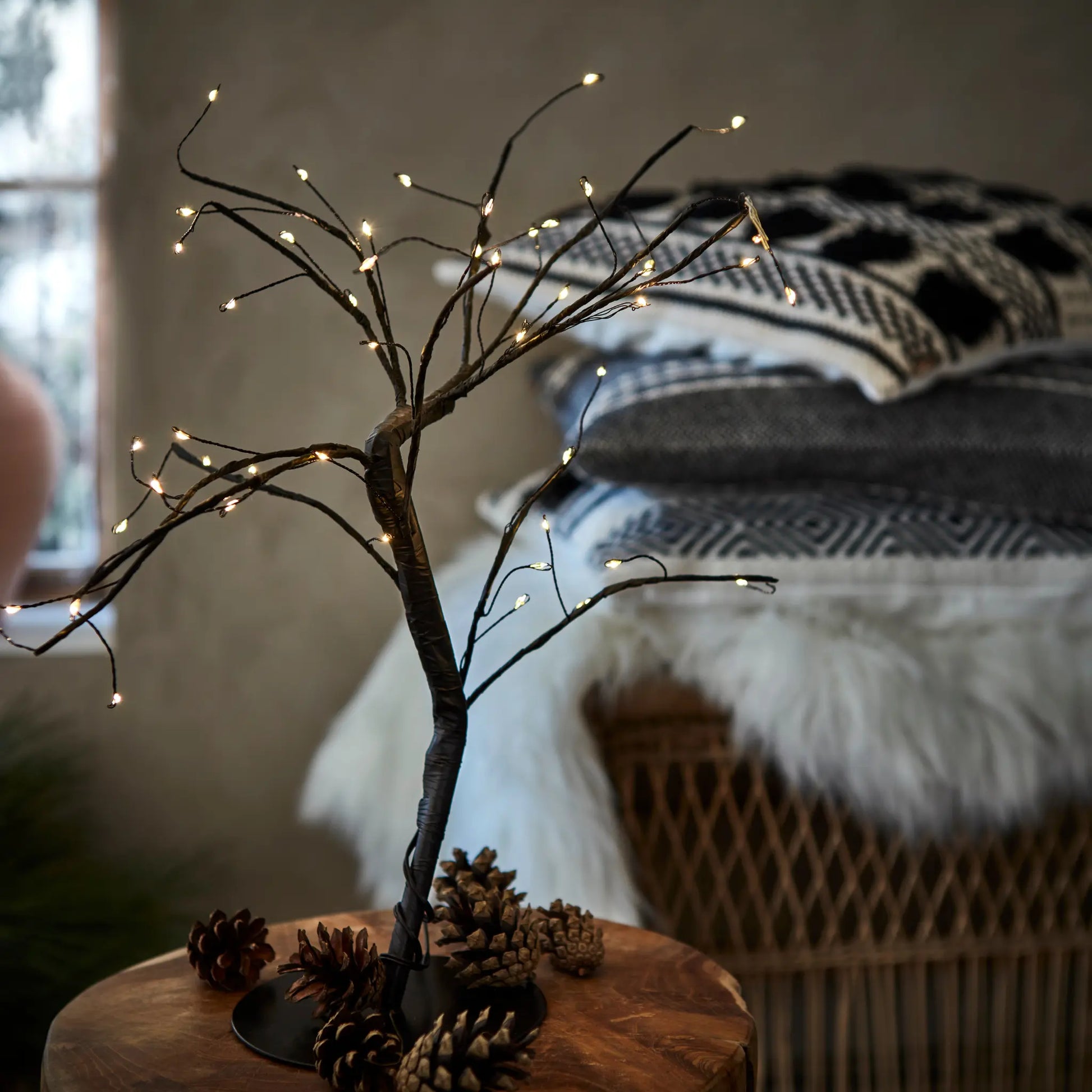GLOW Träd med ljusslinga vit är en dekorativ belysningsdetalj som sprider ett varmt och stämningsfullt sken i hemmet. Med 48 små LED-lampor skapas en mjuk och inbjudande atmosfär som passar perfekt på fönsterbrädan, sidobordet eller som en unik detalj i vardagsrummet. Trädet är tillverkat i järn och koppar med vit yta som ger ett stilrent intryck och gör det enkelt att kombinera med annan inredning. Endast för inomhusbruk, svensk transformator medföljer. Mått: 30x45 cm.