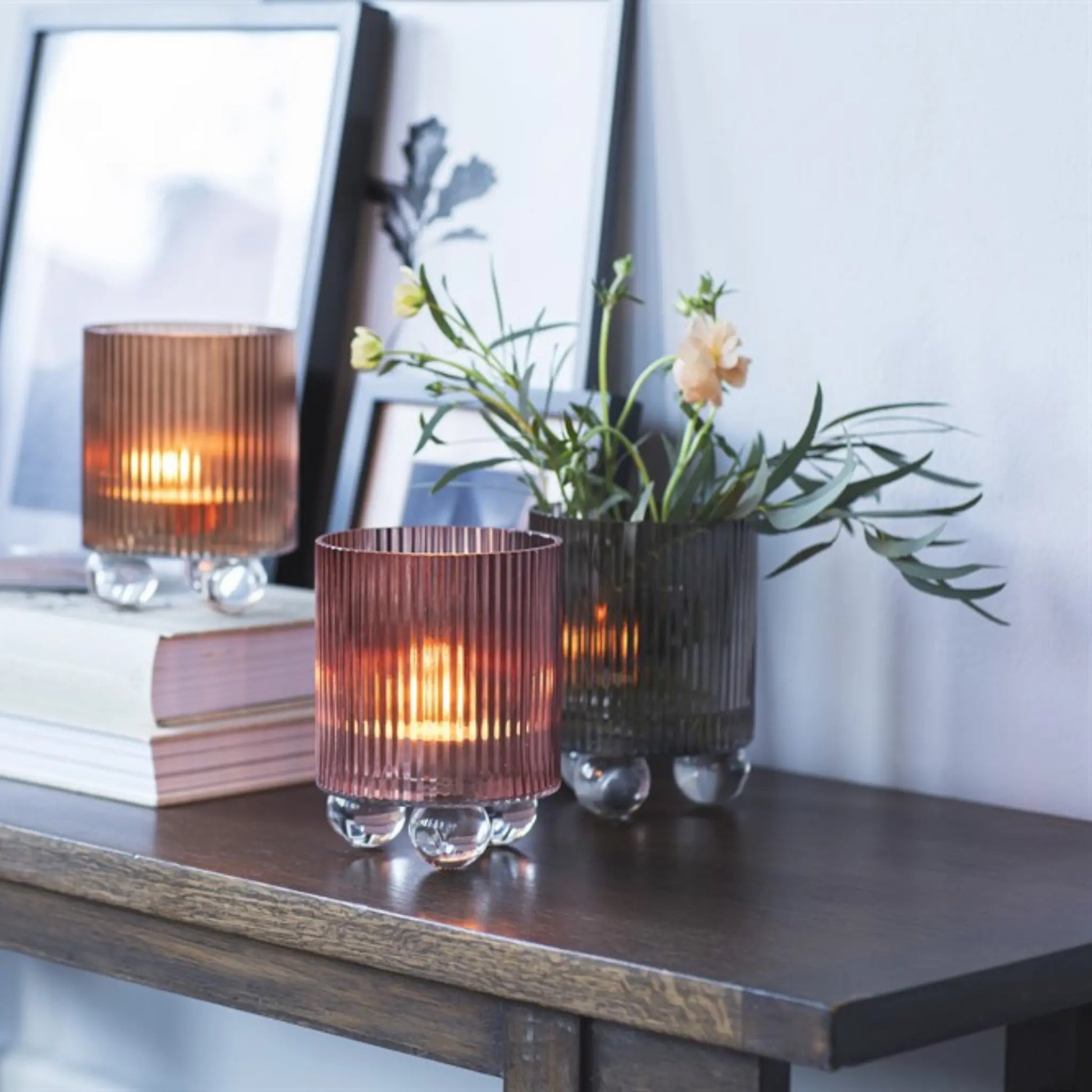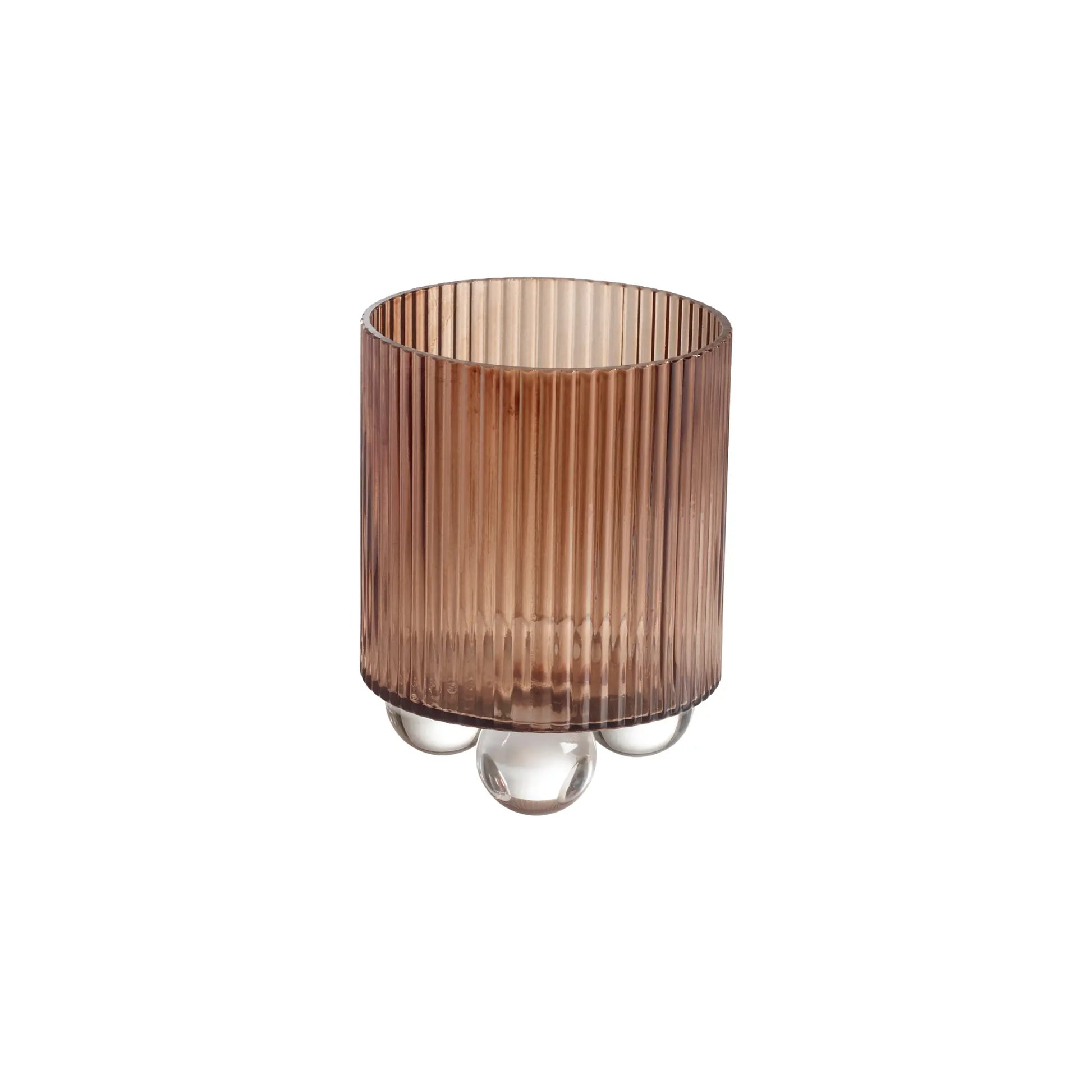 Mogihome bobo ljuslykta brun är en elegant lykta i glas med räfflad struktur som sprider ljuset på ett mjukt och stämningsfullt sätt. Den varma bruna tonen ger en behaglig glöd och skapar en inbjudande känsla i rummet. De tre klara glaskulorna fungerar som dekorativ bas och tillför en modern och lekfull touch. Perfekt för värmeljus och enkel att kombinera med andra lyktor i samma serie. Tillverkad i 100 procent glas med vacker glans och tidlös form.