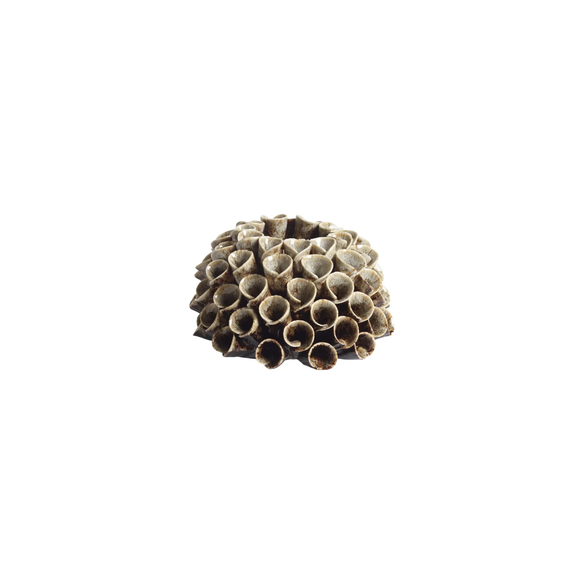 Ljusstake Shelly i mullvadsfärgad keramik är en handgjord ljuslykta med unik form som påminner om organiska strukturer i naturen. Den rustika ytan och mjuka färgtonen skapar en varm och levande känsla när ljuset sprider sig mellan de runda öppningarna. Varje lykta är ett hantverk med små variationer som gör den personlig och genuin. Passar perfekt för värmeljus och ger ett elegant uttryck både ensam och tillsammans med andra varianter i ett vackert stilleben.