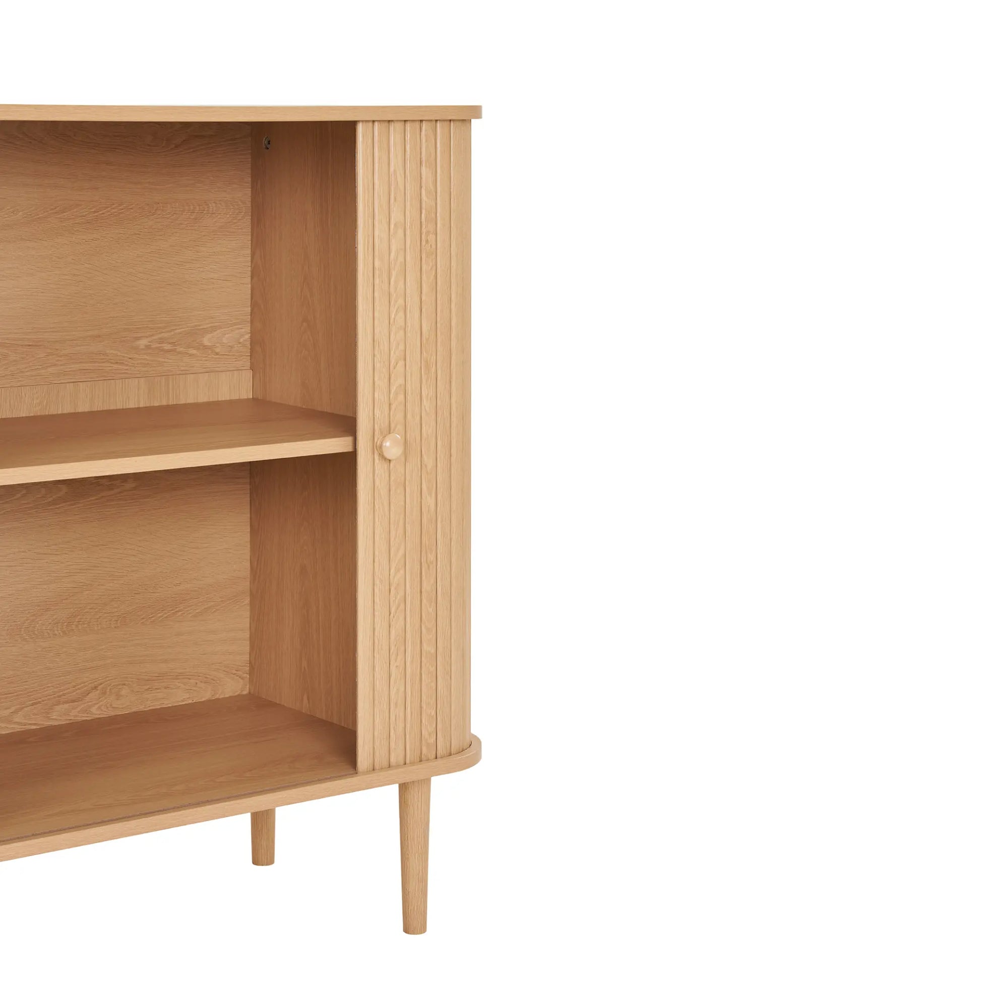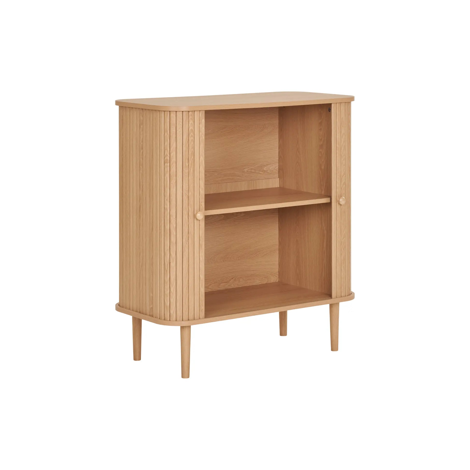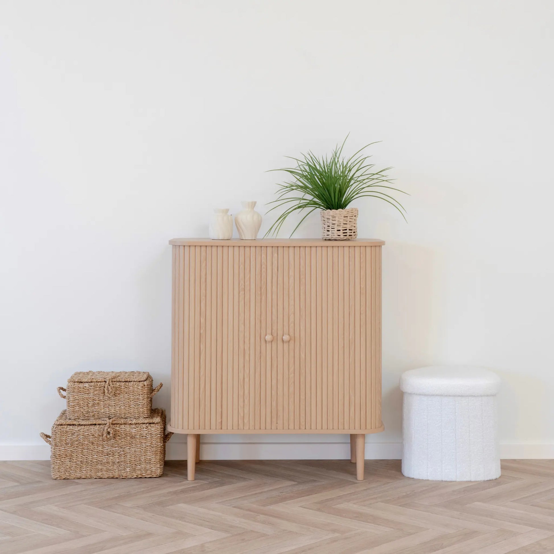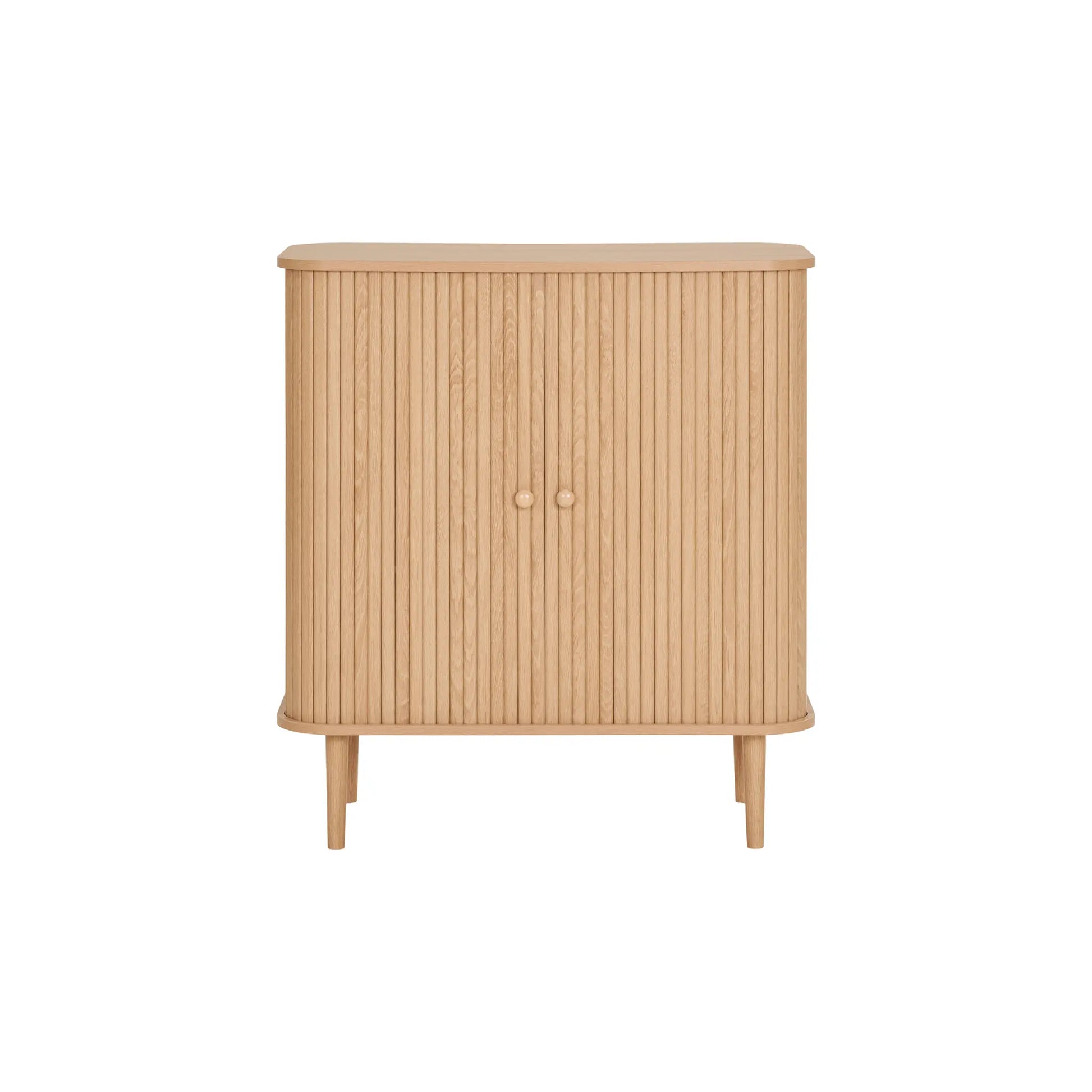 House Nordic, Nikko sidobord i naturlig MDF och furu är en kompakt och stilren förvaringsmöbel med två dörrar. Den räfflade fronten och de rena linjerna ger ett modernt och harmoniskt uttryck som passar i såväl vardagsrum som hall eller sovrum. Sidobordet erbjuder praktisk förvaring för porslin, böcker eller textilier och vilar på ben i massivt furuträ. Det har en maxvikt på 30 kg, är tillverkat av hållbart trä och levereras omonterat men är enkelt att montera.