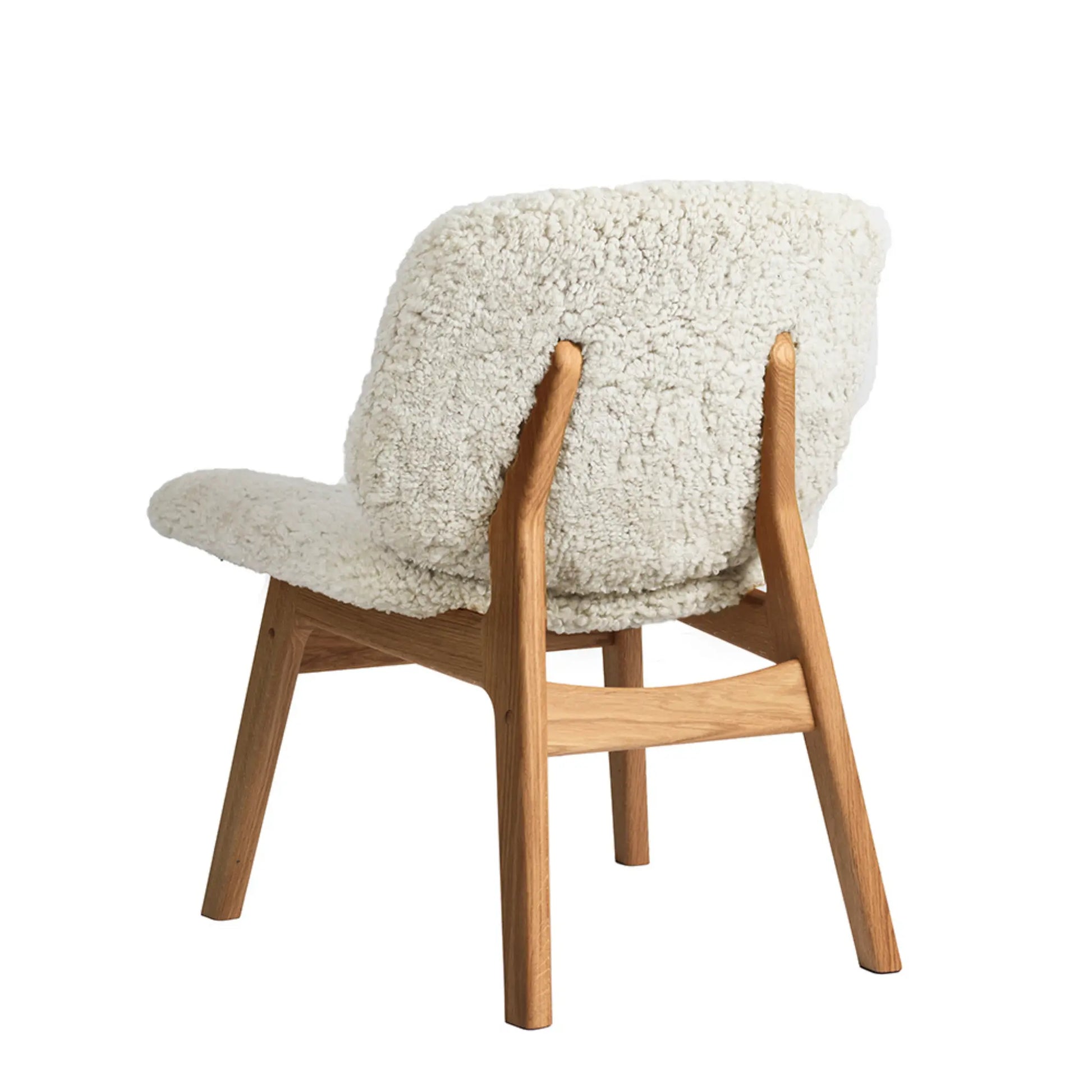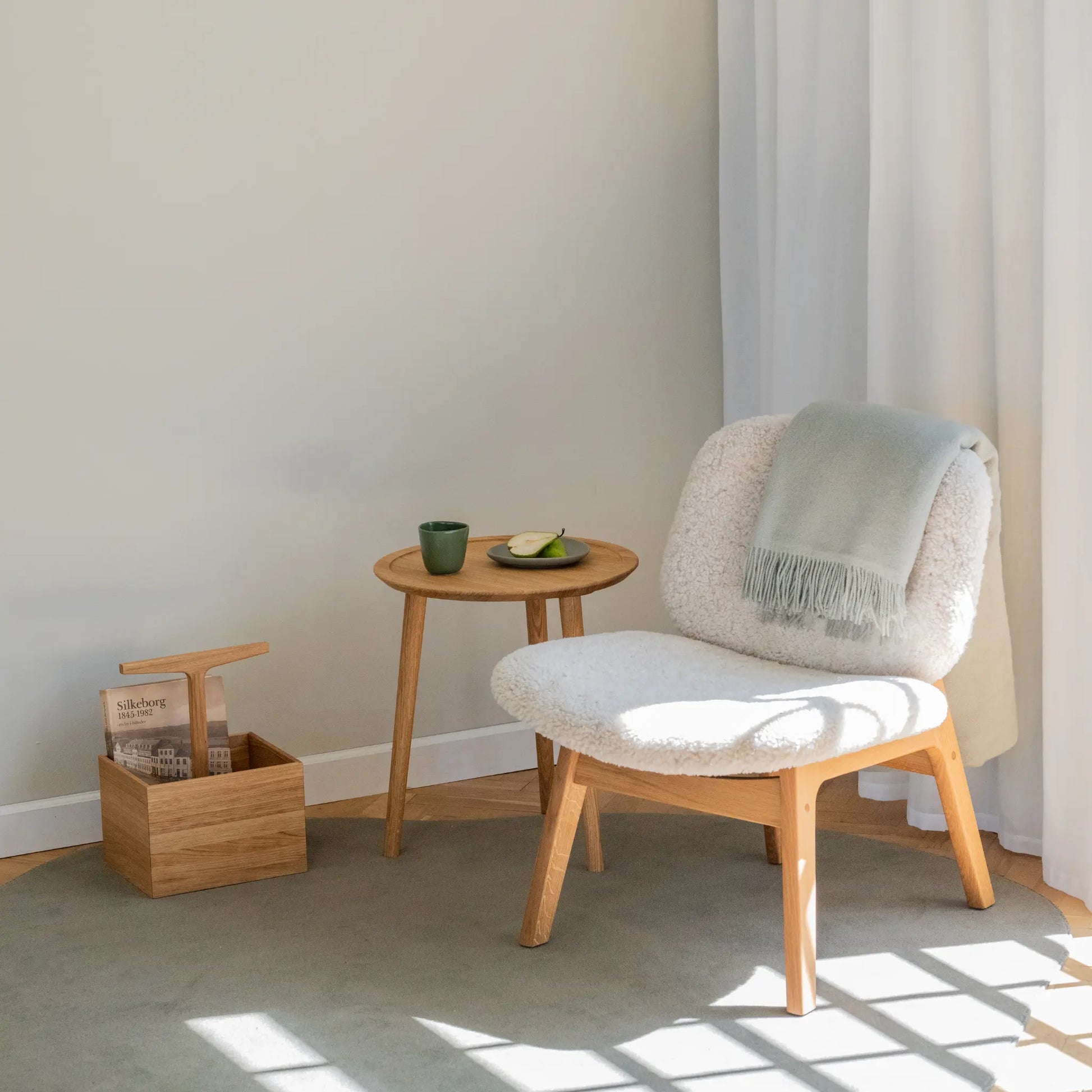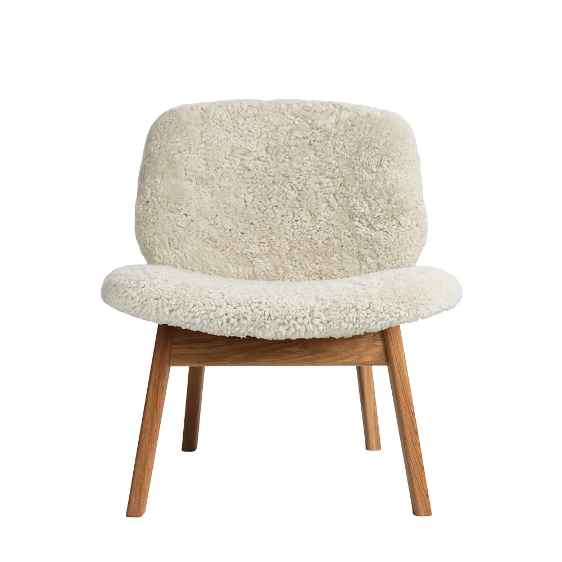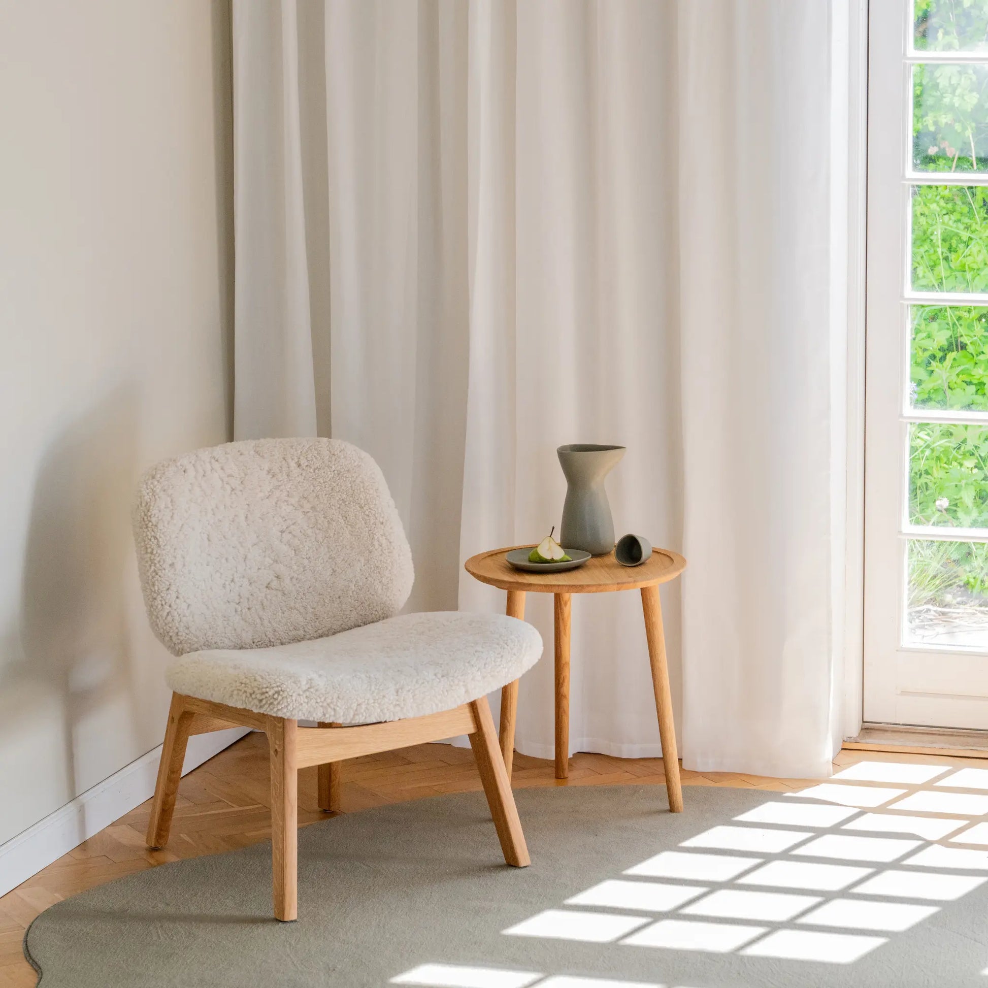 Ro Collection Pandora loungefåtölj ek oljad med fårskinn Moonlight är en elegant och inbjudande fåtölj som kombinerar naturlig mjukhet med skandinavisk design. Den oljade ekramen lyfter fram träets vackra ådring och ger en varm kontrast till det ljusa fårskinnet som klär både sits och rygg. Fåtöljen har en rundad form och generös stoppning som skapar en omslutande och avslappnad sittupplevelse. En tidlös möbel som sprider ljus, värme och harmoni i varje hem.