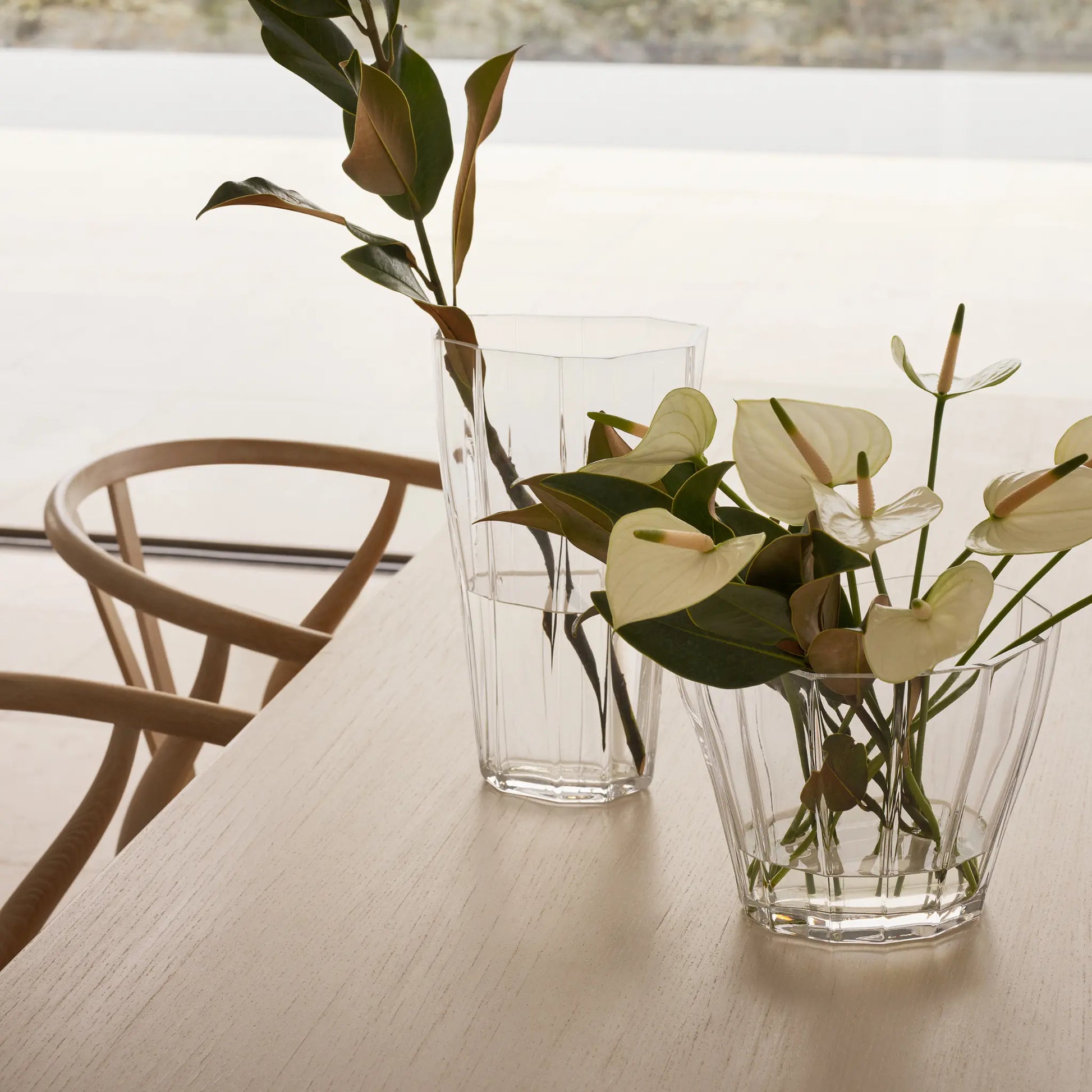 Orrefors Reed vas 175mm är en elegant och harmonisk glasvas formgiven av Monica Förster för Orrefors. Den är tillverkad i klarglas med subtila, mjukt böljande linjer som ger en känsla av rörelse och liv i det hårda materialet. Den lägre formen gör den särskilt vacker för tulpaner eller mindre blomsterarrangemang, och den passar lika fint på ett soffbord som i ett fönster. Vasen är en del av den prisbelönta Reed-serien från 2023, där skandinavisk enkelhet och organisk design möts i en tidlös helhet.