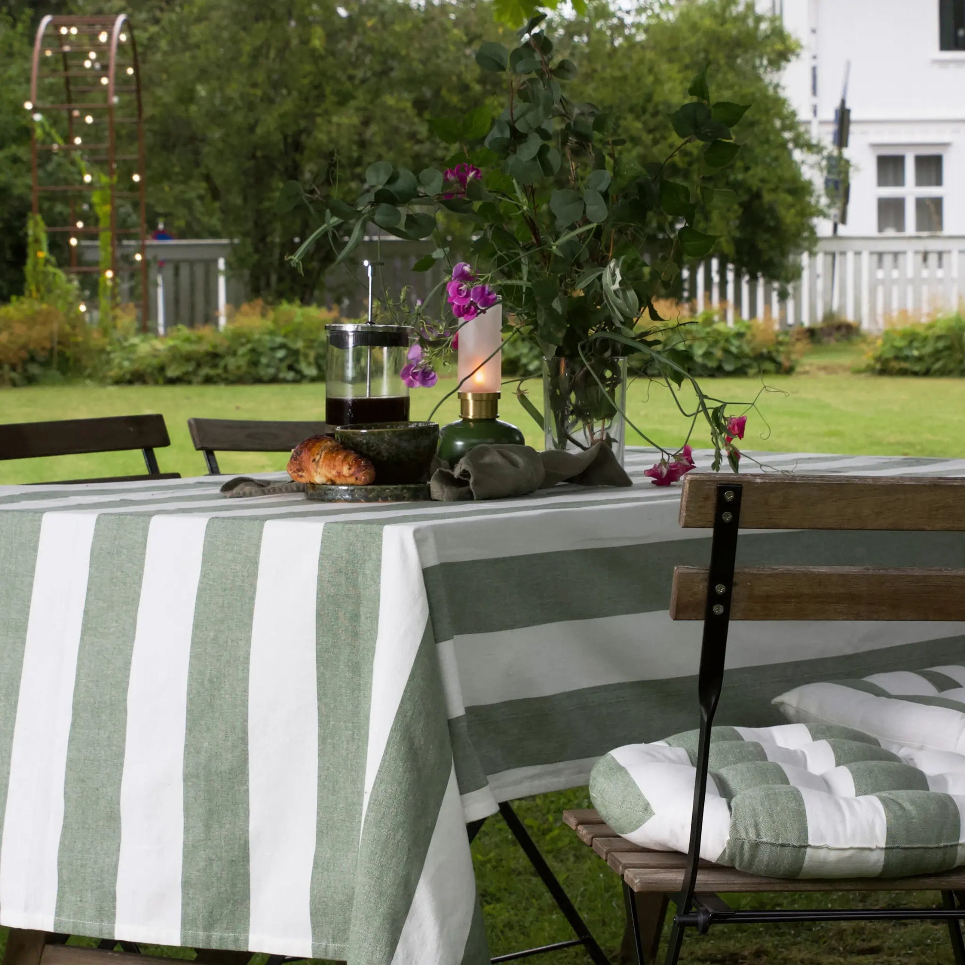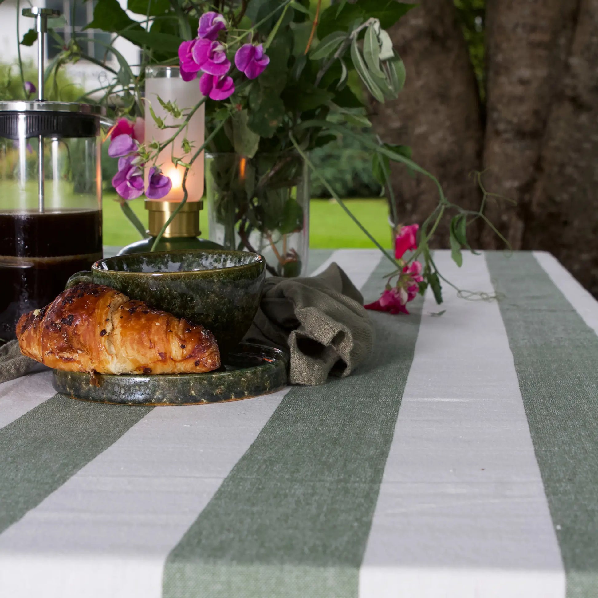 Louise duk mossa i mjuk bomull har ett garnfärgat randmönster som ger ett tidlöst och rofyllt uttryck på matplatsen. Det tvättade tyget ger en behagligt mjuk känsla och ett avslappnat fall som fungerar lika fint vid vardagliga måltider som vid dukningar ute i trädgården. De breda ränderna skapar en harmonisk helhet och gör duken enkel att kombinera med servetter och andra textilier. Produkten är certifierad enligt STANDARD 100 by OEKO TEX, vilket innebär att den är testad och fri från ämnen som kan vara skadliga för hälsan och miljön. Duken kan maskintvättas i 40 grader, klorblekmedel får inte användas, den tål strykning på mellanhög temperatur, ska inte torktumlas och kan kemtvättas vid behov.