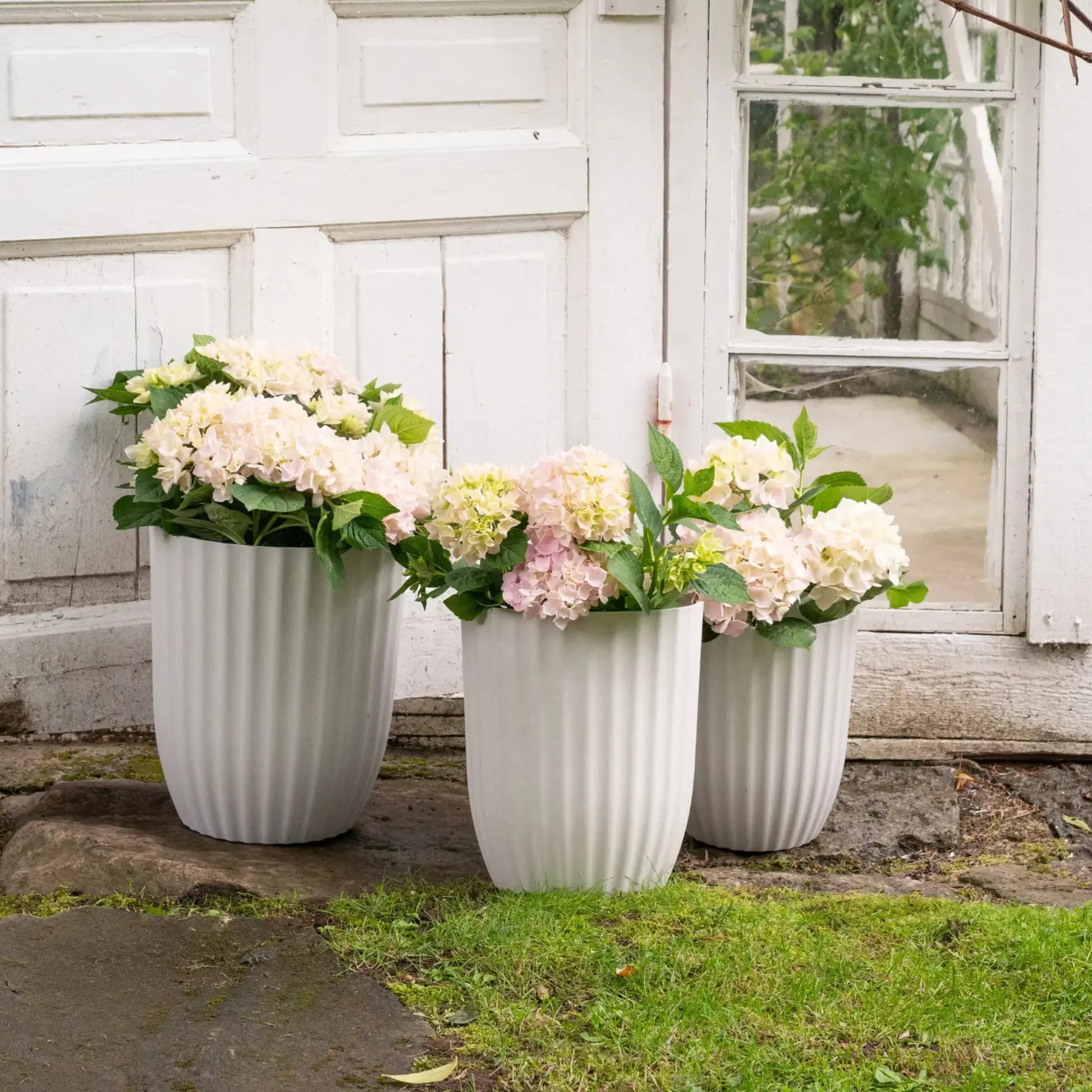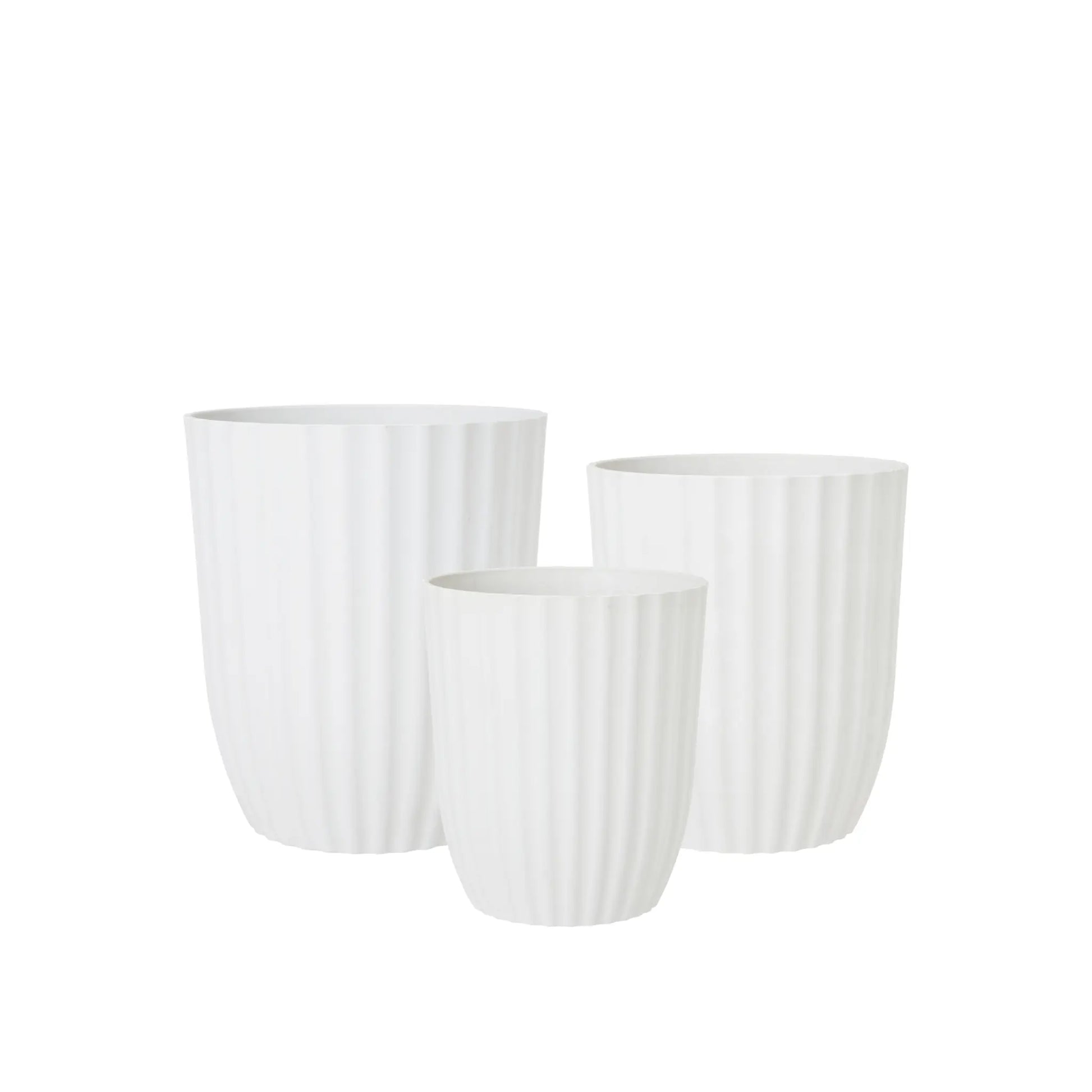 Yodit kruka 3/S vitmelerad i plast är ett stilrent set med tre krukor i olika storlekar. Den räfflade strukturen och matta ytan ger ett modernt och harmoniskt uttryck. Perfekt för konstväxter eller som dekorativa inslag i hemmet.